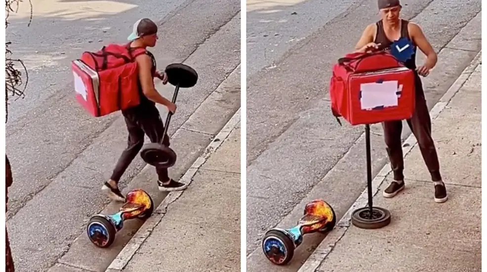 En el video compartido por Nildo Souza, se puede apreciar cómo con su creatividad y fuerza física, logra convertirse en un vehículo para poder moverse con facilidad por las calles de la ciudad. Utilizando un aparato motorizado en sus pies y una barra con ruedas en sus manos, el joven logra realizar entregas de una manera única y llamativa.