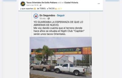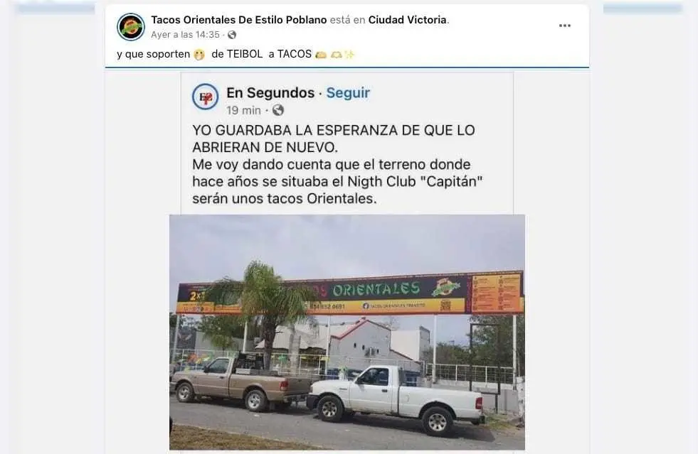 CIUDAD VICTORIA, Tamaulipas.- Un negocio de tacos en Ciudad Victoria, Tamaulipas, se ha vuelto viral en las redes sociales después de que revelaran que el terreno donde se encuentran antes era un club nocturno o table dance. Los Tacos Orientales De Estilo Poblano, como se llaman, han tomado relevancia en la comunidad luego de que un ciudadano recordara el pasado del lugar.