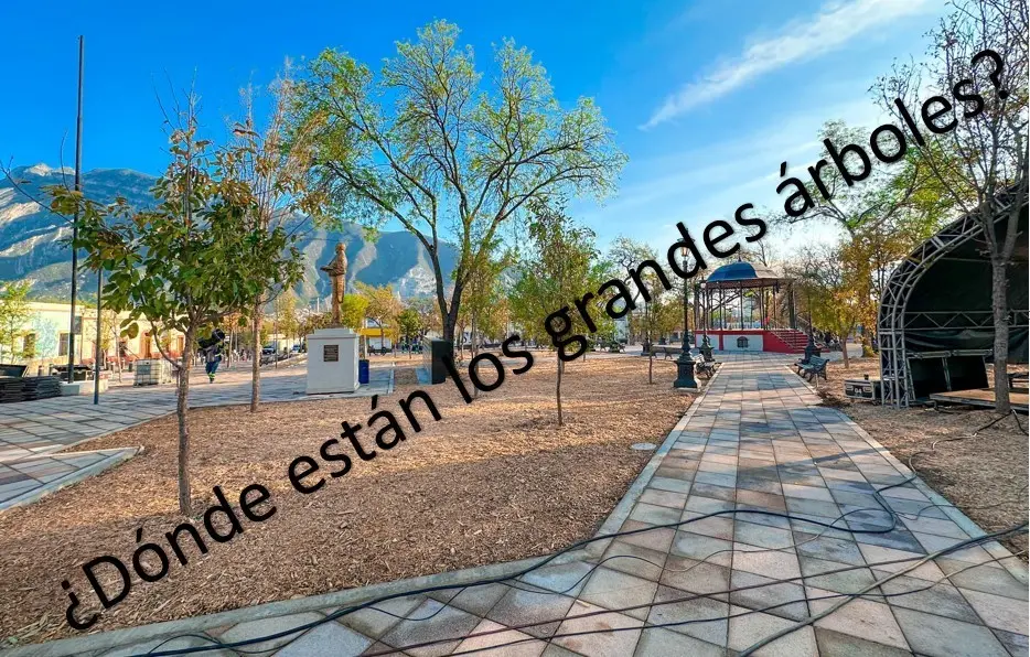 El alcalde Miguel Treviño mostró en Facebook la nueva imagen de la plaza Juárez en San Pedro, sin embargo los sampetrinos cuestionaron al edil y preguntaron qué hicieron con los grandes árboles.