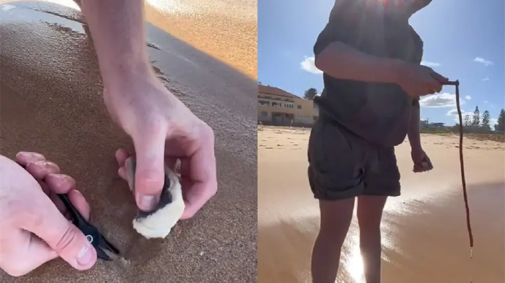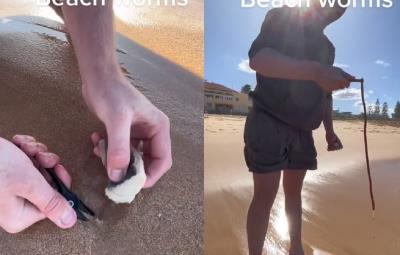 Un joven logró sacar de la arena de una playa de Australia a un enorme gusano; le puso un trozo de carne de pescado para motivarlo a salir de la arena y con ayuda de unas pizas logró extraerlo.