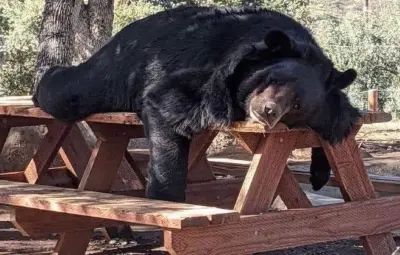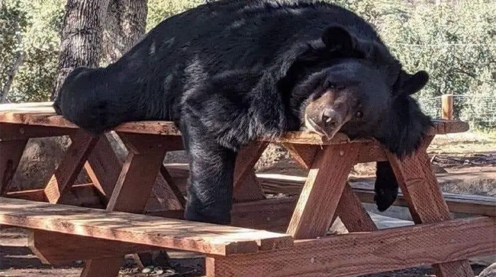 La más reciente foto se compartió en X (antes Twitter), donde una fotografía que muestra a un enorme oso negro descansando sobre una banca de madera.