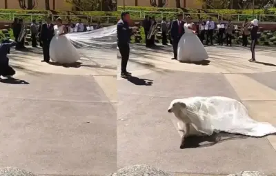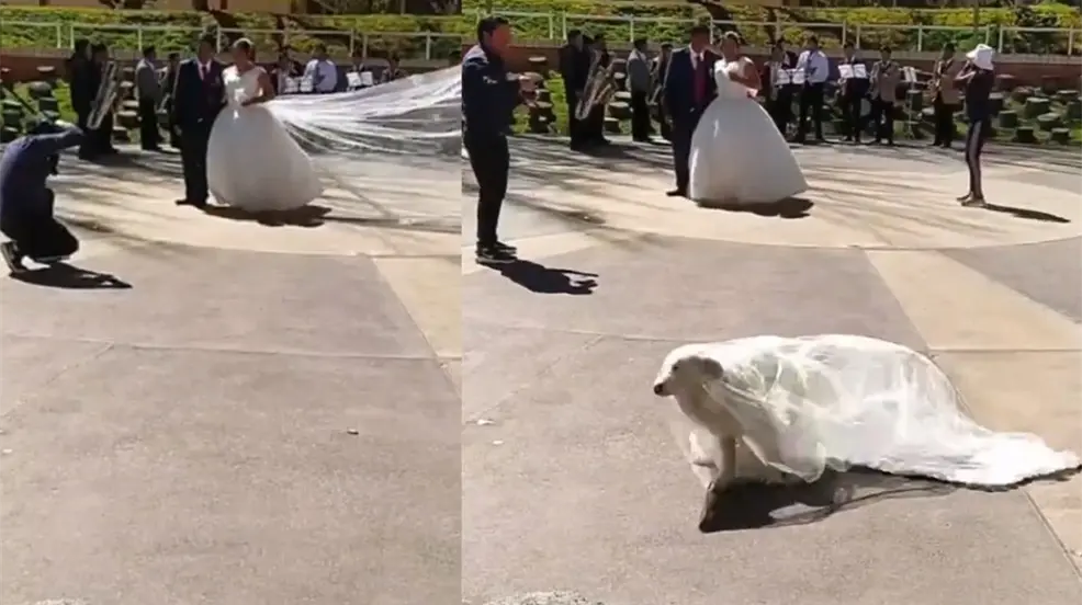 La pareja de novios posaban a la cámara y una persona sostenía el velo de la novia, pero el gusto duró poco ya que al extender el velo "Firulais" apareció corriendo rápidamente para tomar el velo de la novia y continuar con su carrera alrededor de la feliz pareja.