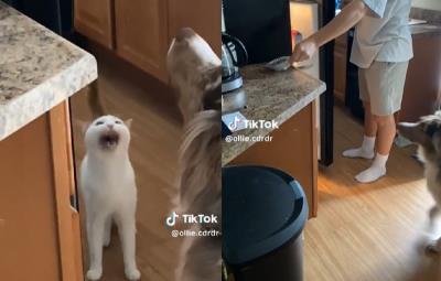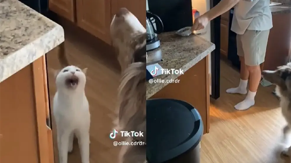 El video compartido por el usuario de TikTok, ollie.cdrdr, se puede observar como el hombre se dirige a su refrigerador en compañía del gato "Sam" y un perro, al abrir la puerta saca un recipiente empaquetado, lo coloca sobre la barra de la cocina, lo vuelve a tomar y comienza a abrirlo.