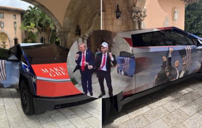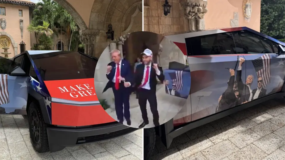 ESTADOS UNIDOS.- El ex presidente de los Estados Unidos, Donald Trump, recibió una sorprendente Cybertruck de Tesla totalmente personalizada como regalo de parte del controvertido streamer Adin Ross. Durante una transmisión en vivo desde la residencia de Mar-a-Lago en Florida, Trump recibió el vehículo decorado con su icónica foto y el eslogan Make America Great Again.