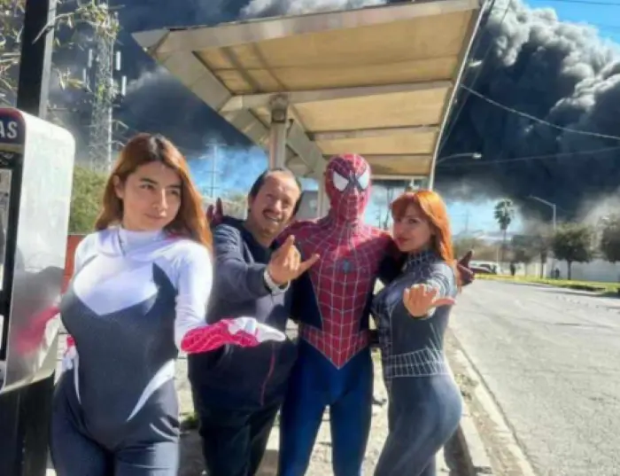 SAN NICOLÁS DE LOS GARZA, Nuevo León.- Un grupo de amigos disfrazados de Súper Héroes fue sorprendido cerca de un incendio que se pudo observar desde varios puntos de la zona metropolitana.