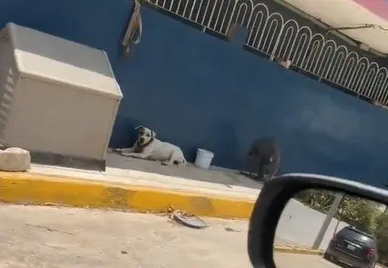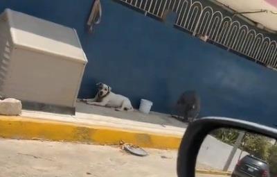 El video muestra al canino acostado sobre la acera, con un abanico de piso apuntando directamente hacia él.