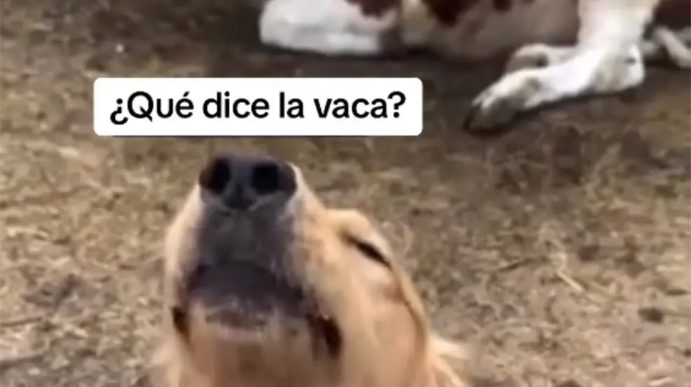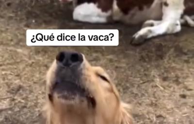 En el clip se escucha decir a una mujer “¿qué dice la vaca?”, por lo que el perrito, que parecer ser un Golden Retriever, responde tratando de imitar el característico sonido que realizan estos animalitos.
