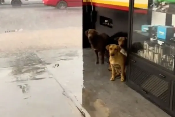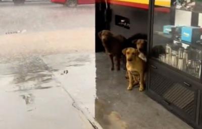 En Twitter se hizo viral un video donde se aprecia el momento en que por la intensa lluvia un par de lomitos se protegen en un taller mecánico.