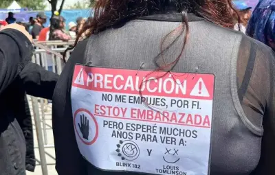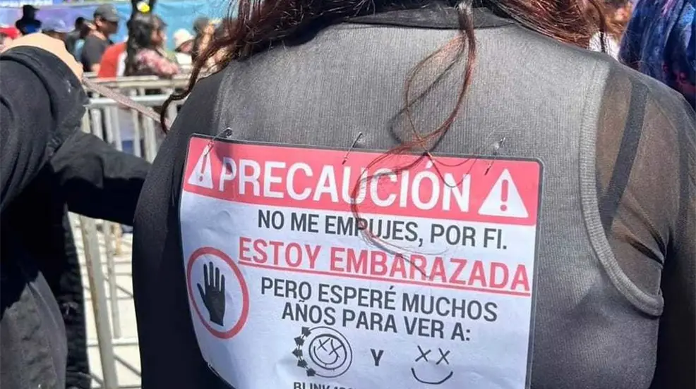 MONTERREY, Nuevo León.- Una mujer se volvió viral en el festival Tecate Pa'l Norte en Monterrey por el divertido cartel que llevaba pegado en su espalda. La imagen de la mujer con el mensaje: "No me empujes, por fi. Estoy Embarazada, pero esperé muchos años para ver a Blink182 y a Luis Tomlinson", se viralizó en redes sociales, causando risas y sorpresa entre los asistentes.