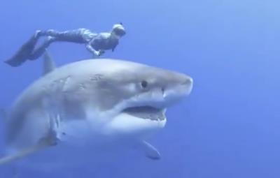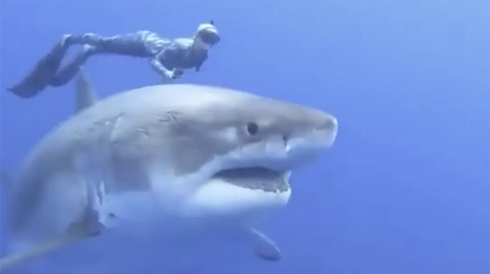 La escena, capturada en video, muestra el momento en que Ramsey se sumerge con gracia en el agua cristalina, compartiendo el espacio con el imponente tiburón blanco. Con una calma y confianza notable, la buceadora muestra un profundo respeto por el depredador marino mientras nada a su lado.