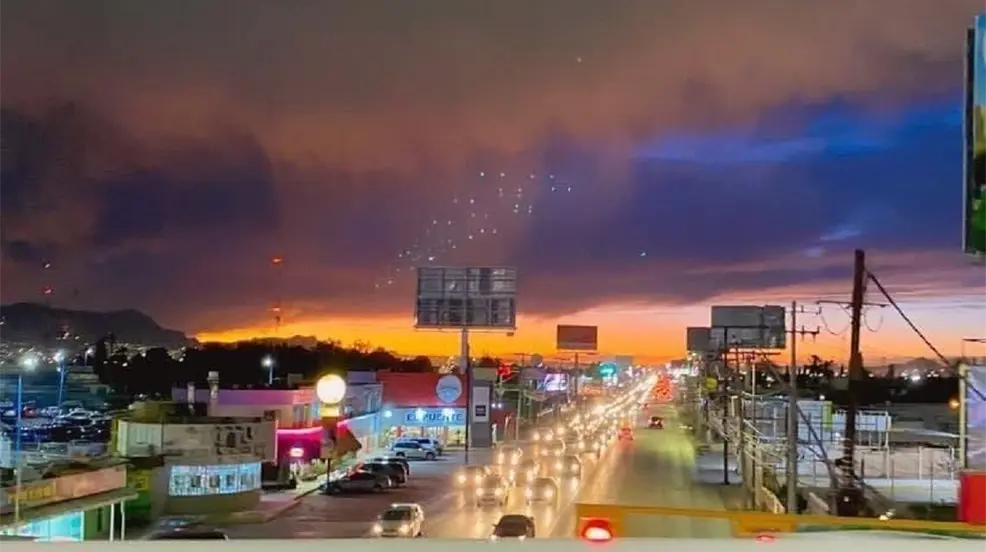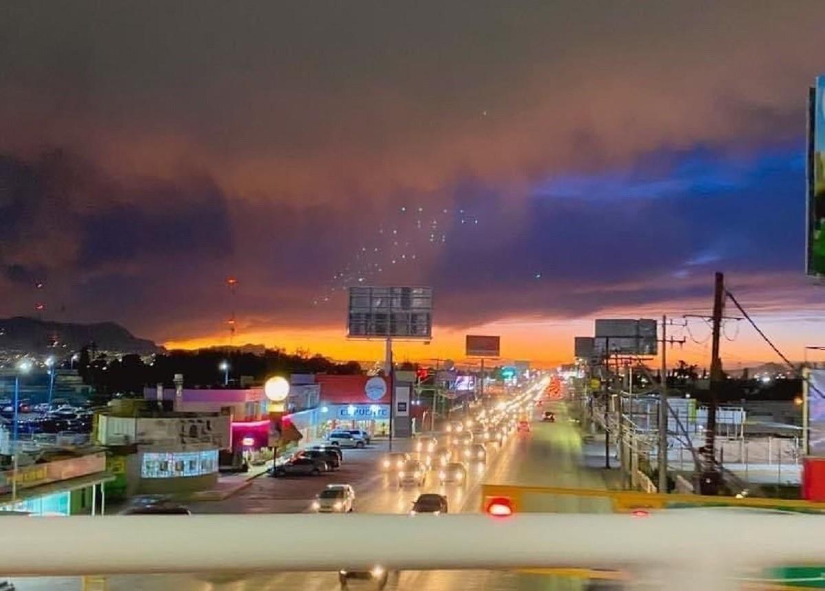 En la imagen se puede apreciar el atardecer en Ciudad Juárez y en el cielo decenas de objetos voladores no identificados que emiten ante el paso de cientos de automovilistas que circulaban por la zona donde fueron captados.