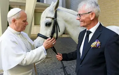El último regalo que ha recibido muy llamativo es un caballo purasangre árabe de 12 años, llamado “Proton”, donado por los establos Michalski de Polonia y entregado personalmente por Andrzej Michalsk antes de la audiencia de los miércoles.