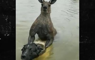 Después de un rato se dio cuenta de que el canguro le miraba fijamente en el río y luego su mascota salió del agua, chillando mientras le salía agua a borbotones de la boca.