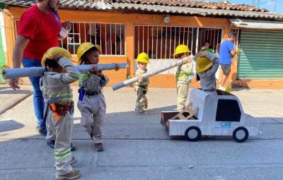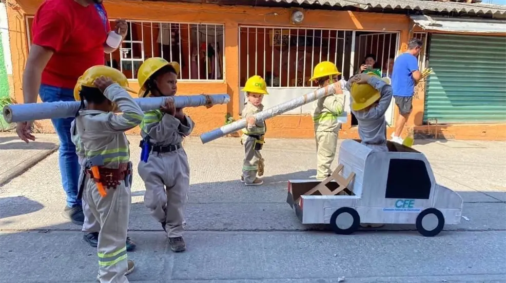 Los pequeños portaban uniformes color caqui, cascos amarillos y cuerdas, e incluso llevaron postes y cableado para simbolizar su labor en la restitución del servicio eléctrico en las comunidades afectadas por el huracán Otis.