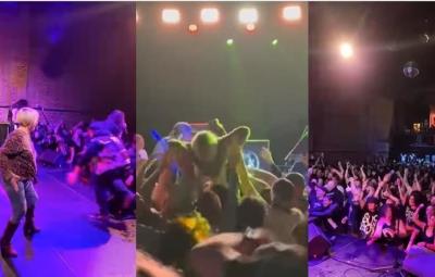 ESTADOS UNIDOS.- Sin importar su edad, una mujer se dedicó a vivir al máximo el concierto donde su hijo tocaba como baterista y en medio de la euforia se lanzó al público.
