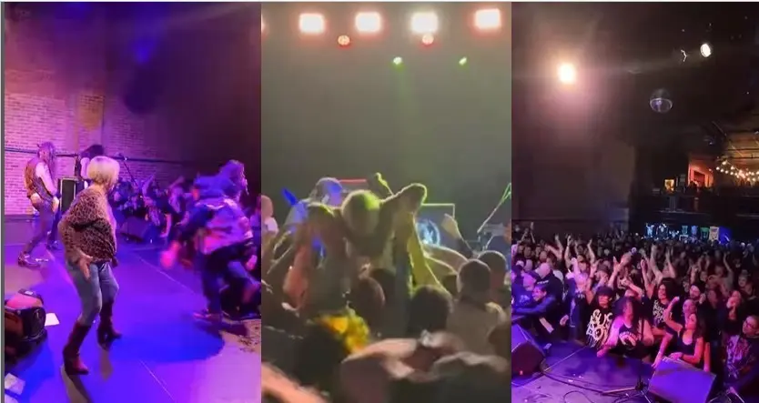 Todo sucedió durante la presentación de la banda Municipal Waste, según la publicación del sitio nuclearblastrecords y en las imágenes se puede ver como la dama de edad avanzada volteaba y parecía pedirle el visto bueno a su vástago y aunque por momentos se ve titubeante, al final salta como si fuera a lanzarse a una alberca.