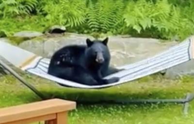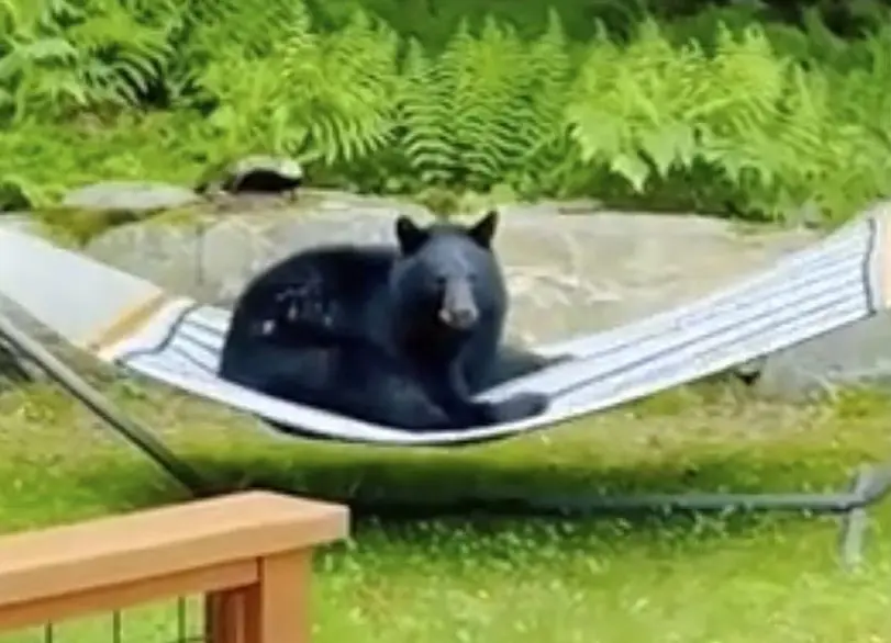 VERMONT, Estados Unidos.- Una pareja logró ver varios osos negros en los alrededores de su casa en Vermont, pero nunca habían visto algo como un oso relajándose en su hamaca.