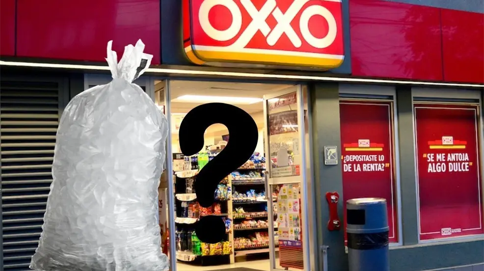 Tienda Oxxo con una bolsa de hielo y la pregunta es si hay hielo. Foto: Oxxo/Canva.