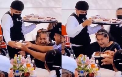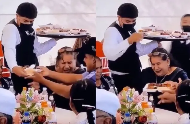 Esto fue captado en video y publicado por la cuenta @Soy_leonidas en Twitter, en las imágenes se observa el momento en que, a la hora de ofrecer los sagrados alimentos, un joven se acerca con una charola para repartir los platillos a los invitados, pero el detalle era que cargaba más de cinco platos de unicel, esto mientras sus compañeros le ayudaban a distribuirlos a las demás mesas.