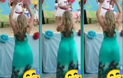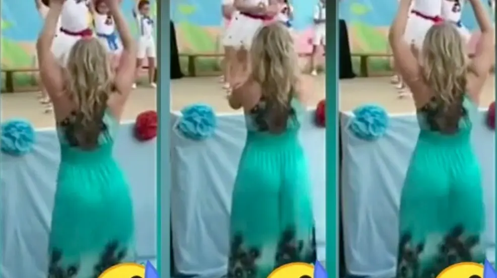 En el video viral de la maestra, de tan solo 25 segundos, se observa a la mujer con un vestido color verde agua, bailando de espaldas y con manos que frecuentemente lleva a la cadera.