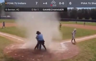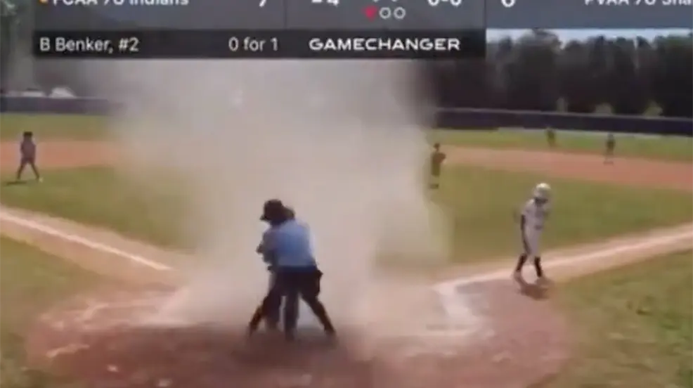Tras ver que el pequeño quedó atrapado por el viento, polvo y tierra, el umpire tomó una rápida decisión y tomó al pequeño, salvándolo del tornado.