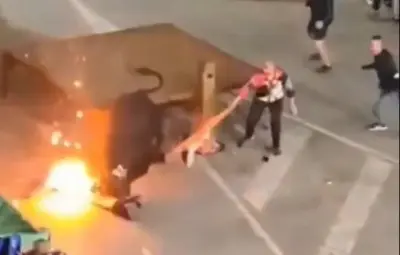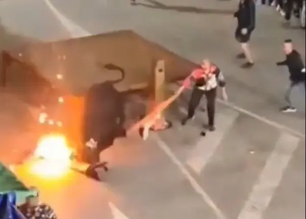Un toro atacó a un hombre después de que este le prendiera fuegos artificiales en sus cuernos en plena fiesta de España; el momento quedó captado en video.
