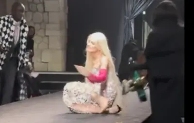 La modelo Kristen McMenamy sufrió un momento incómodo en la pasarela, en el marco de la Semana de la Moda en París, todo por sus zapatos de aguja