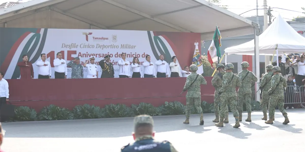 Encabezando el presidium el gobernador del Estado Américo Villarreal Anaya, el titular del Poder Legislativo, el presidente de la Junta de Gobierno del Congreso del Estado, diputado Humberto Prieto Herrera, así como la titular del Poder Judicial, la magistrada presidenta del Supremo Tribunal de Justicia, Tania Gisela Contreras López, da inicio el desfile del 115 aniversario del inicio de la Revolución Mexicana.