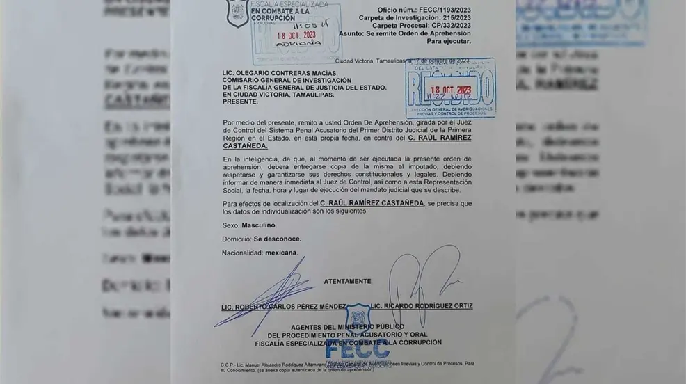 VICTORIA, Tamaulipas.- Un Juez de Control otorgó al Ministerio Público de la Fiscalía Anticorrupción de Tamaulipas, una orden de aprehensión en contra de Raúl “R”, titular de la misma dependencia.