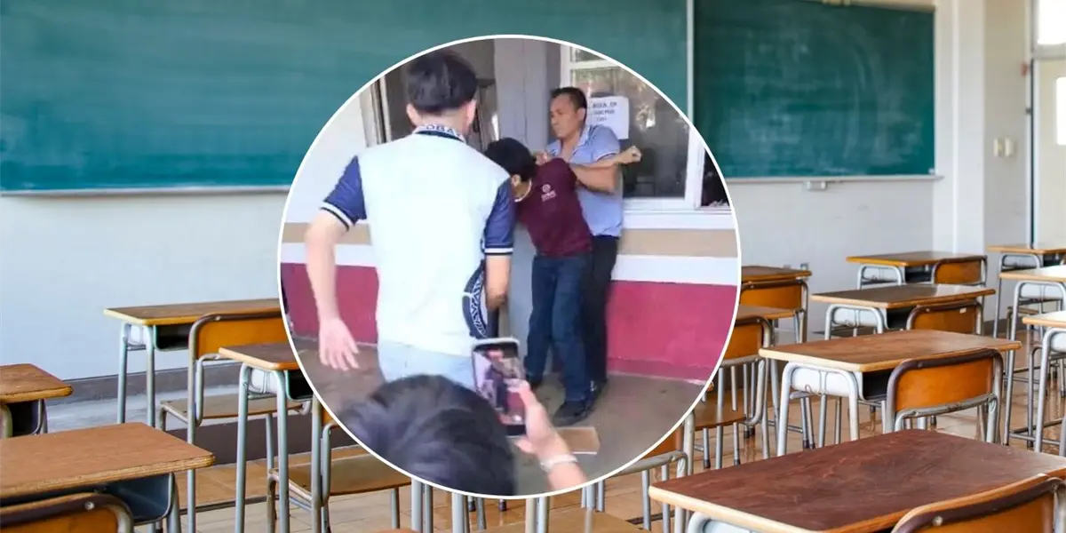 Pero en otra parte del vídeo, se muestra cómo el alumno se ve alterado por la acción del profesor, lo que hizo que fuera detenido de los brazos, pero el joven, usando sus piernas, también logra agredir a otro maestro pateándolo.